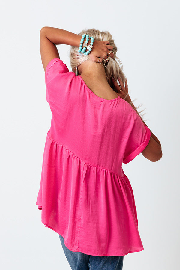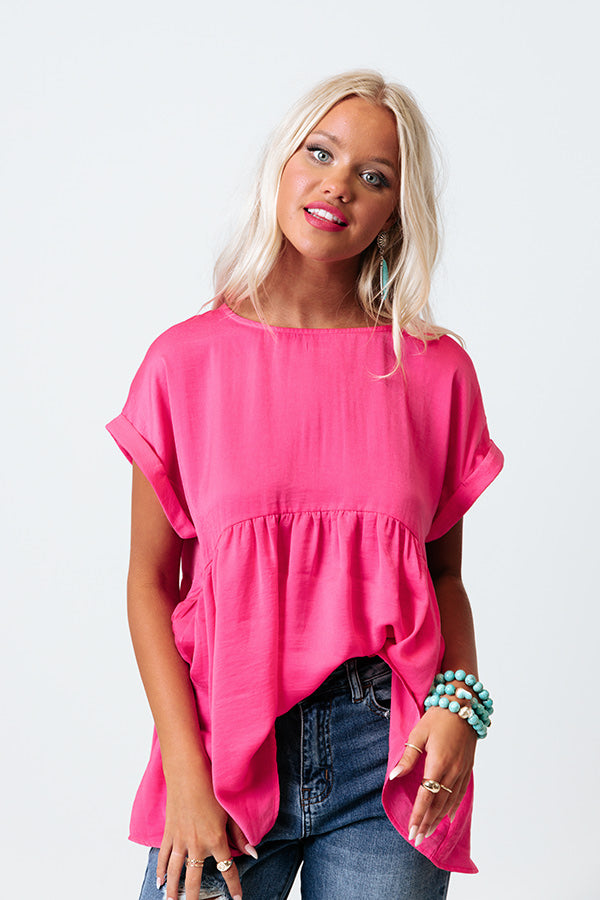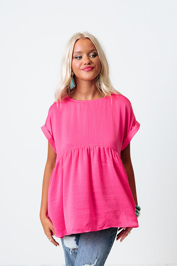 Slay all day in our adorable pink 'Worth The Bubbly' top featuring lightweight and flowy satin material, a rounded neckline, short loose sleeves with rolled cuffs, and a relaxed babydoll silhouette that falls into an uneven hemline!