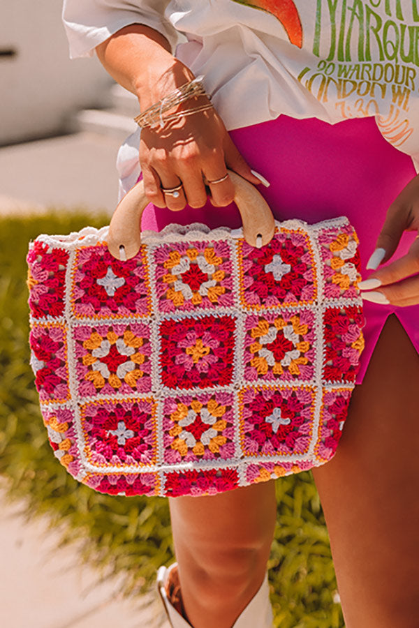 The perfect boho summer bag, our cute 'Writing Love Letters' bag features pretty fuchsia, hot pink, peach, and light yellow crochet square material, two wooded handles, and a spacious fully lined interior!