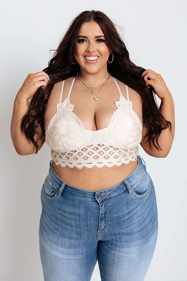 Plus Size - Add a femme and flirty touch to any look with our cream colored 'Writing Love Notes' bralette featuring a fabric lined triangle cut bust, intricate crochet detailing, twin adjustable spaghetti straps that cross over a smocked elastic back, and a wide waistband with a scalloped hemline! This bralette comes with removable padding. Measurements