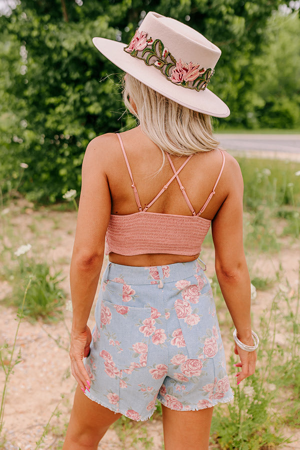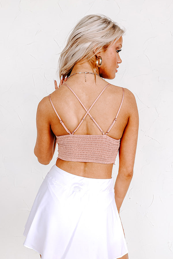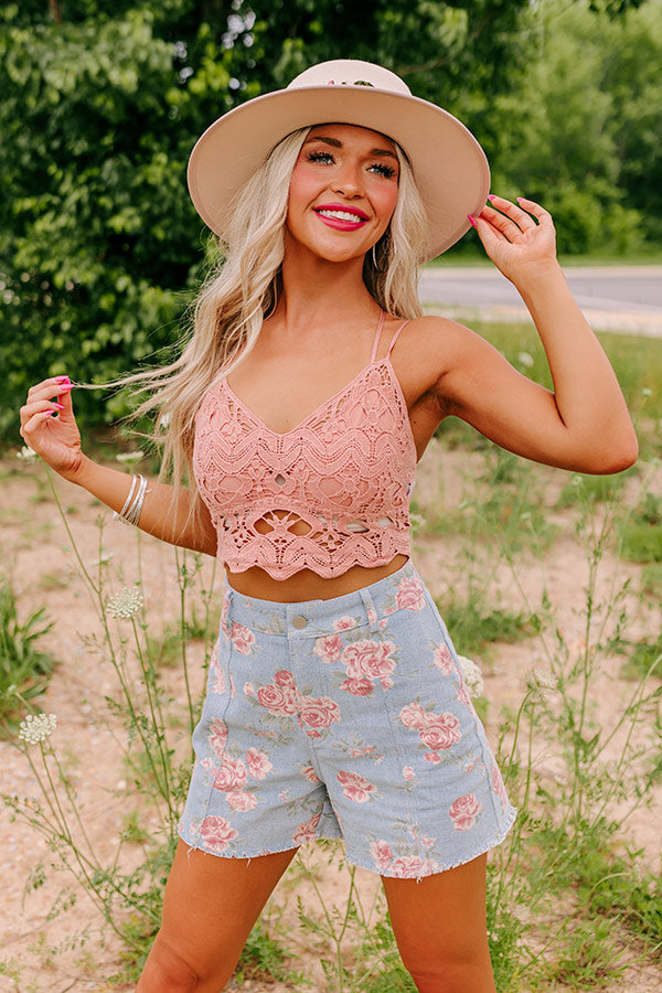 Add a feminine and flirty touch to any layered look with our adorable rustic rose colored "Year Around Love Affair" bralette featuring lightweight material with intricate crochet detailing, lined triangle cups with a v-cut neckline, a wide semi-sheer laced bottom band with scalloped trim, four adjustable spaghetti straps with two crossing in the back, and a form fitting silhouette with a smocked back!