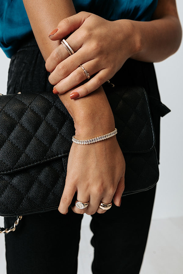Glisten up your arm candy stack with our luxe silver 'You Are Invited' bracelet featuring a wide cubic zirconia band with an adjustable clasp!