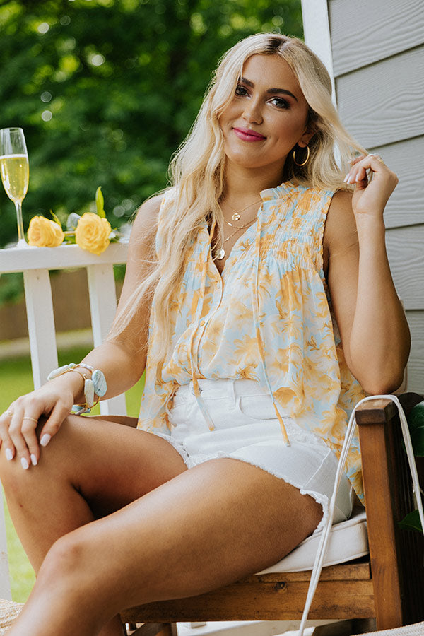 You deserve flowers and a new addition to your wardrobe...and we have the perfect piece! This adorable light blue hued shift top features lightweight breezy material patterned with a golden honey colored floral print, a v-cut neckline with a subtle ruffled tie closure collar, wide sleeveless shoulder straps, and a relaxed silhouette that falls into a rounded hemline!