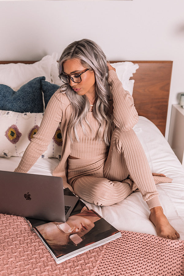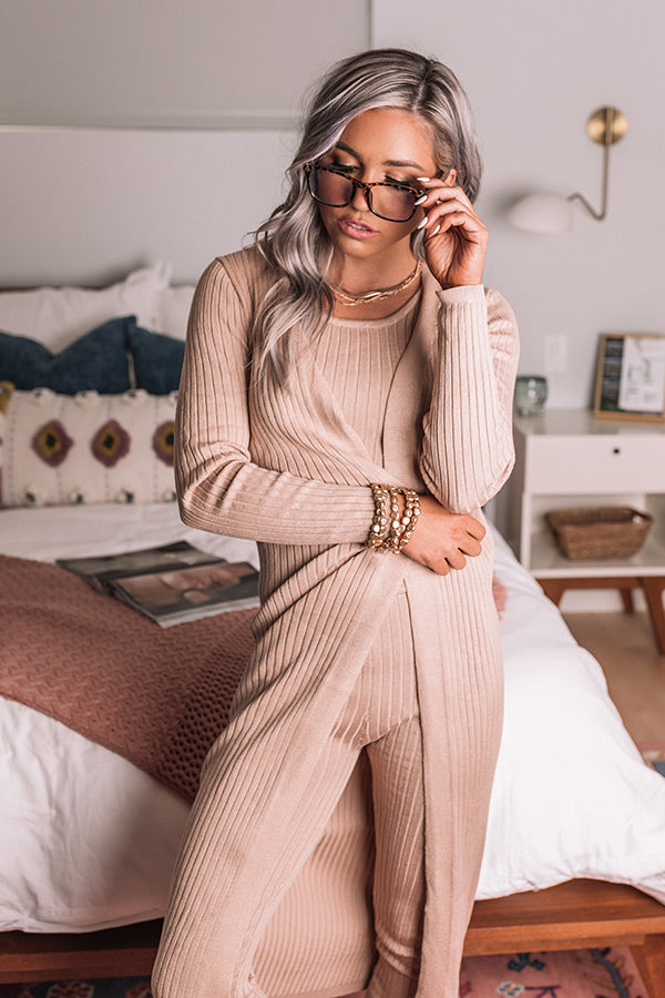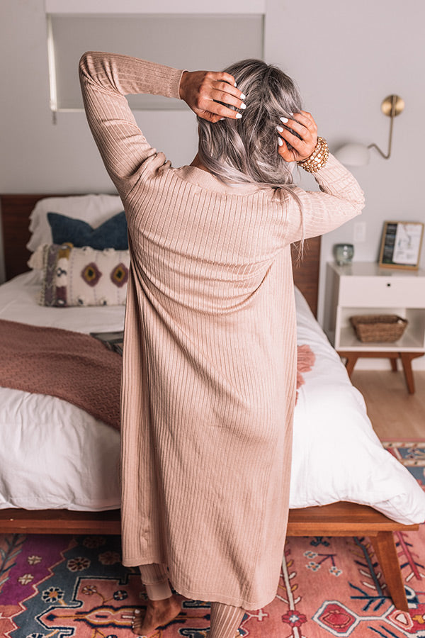 You glow girl! Shine bright in this adorable iced latte colored cardigan featuring soft lightweight material with vertical ribbed texturing, long loose sleeves, and a draped open front silhouette that ends in a straight mid-calf length hemline! Measurements