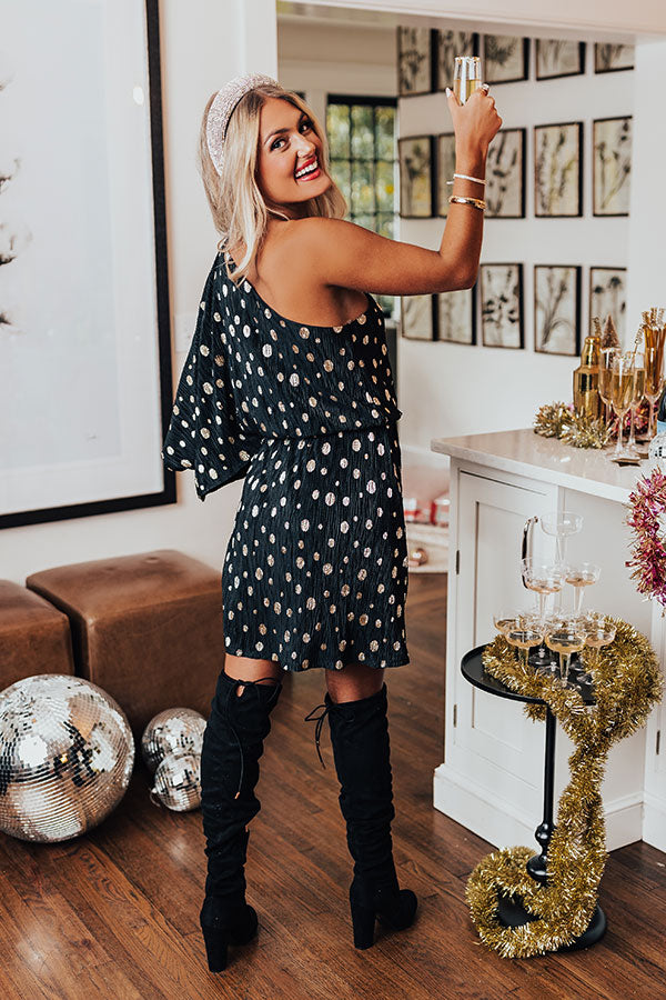 Arrive in style in our glamorous black 'You Had Me At Cocktails' dress featuring lightweight material patterned with gold polka dots, a diagonal neckline and upper back with a single 3/4-length batwing sleeve, a cinched waistline, and a relaxed skirt silhouette that falls into a straight mid-thigh length hemline!