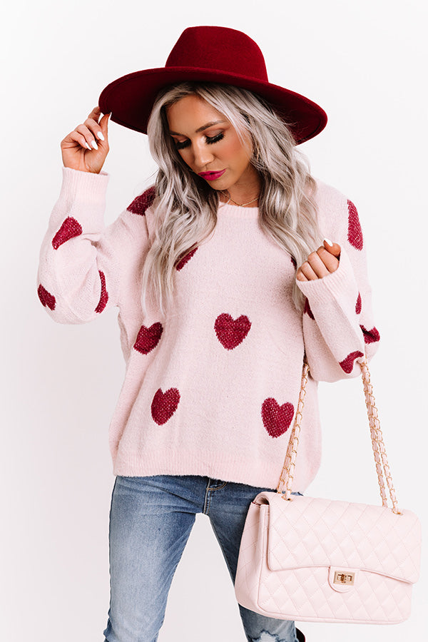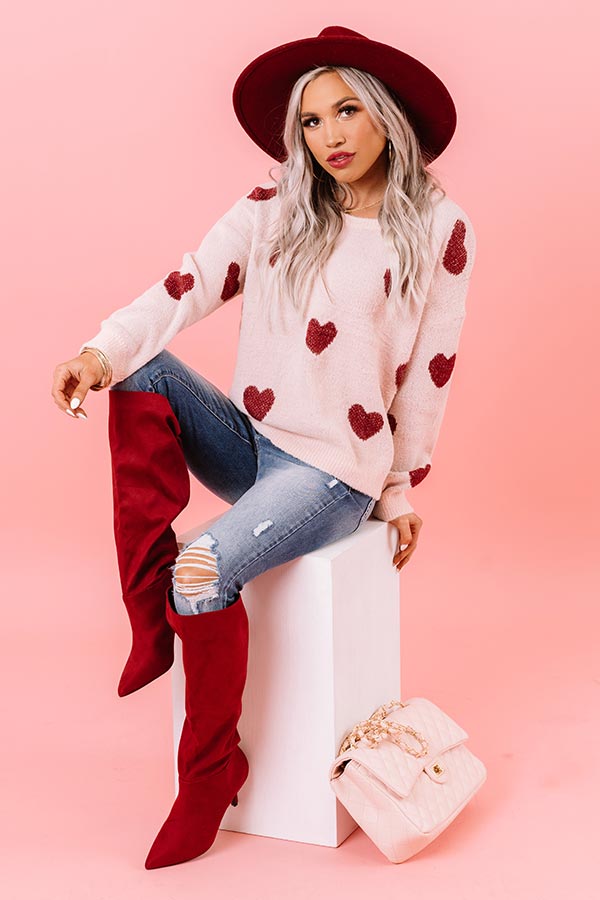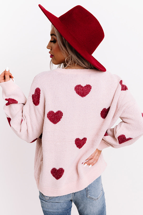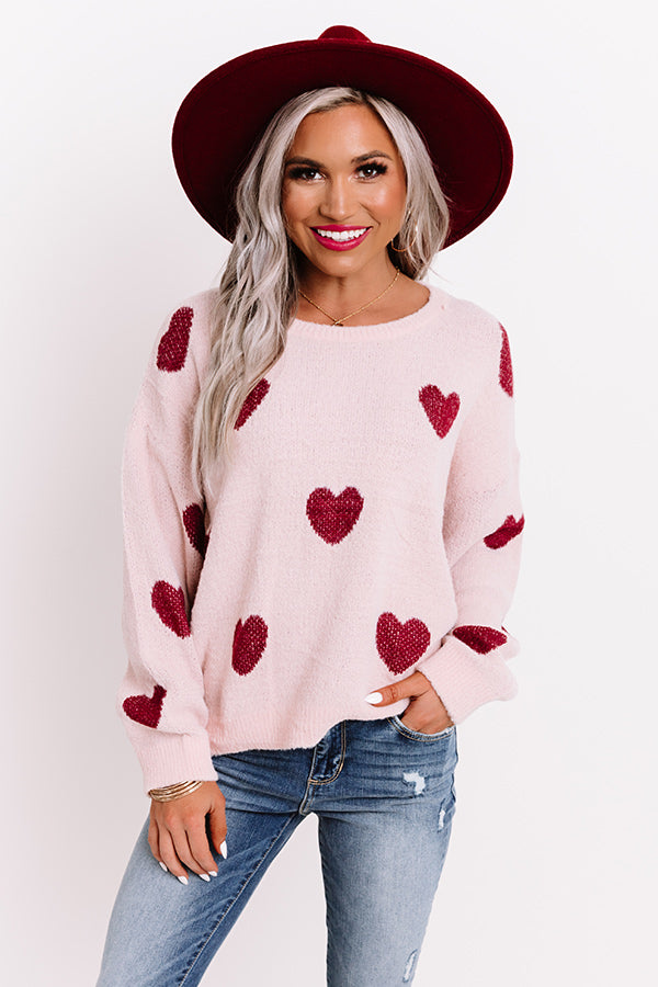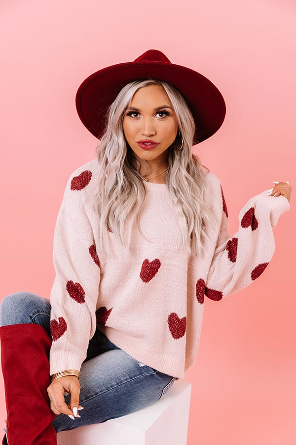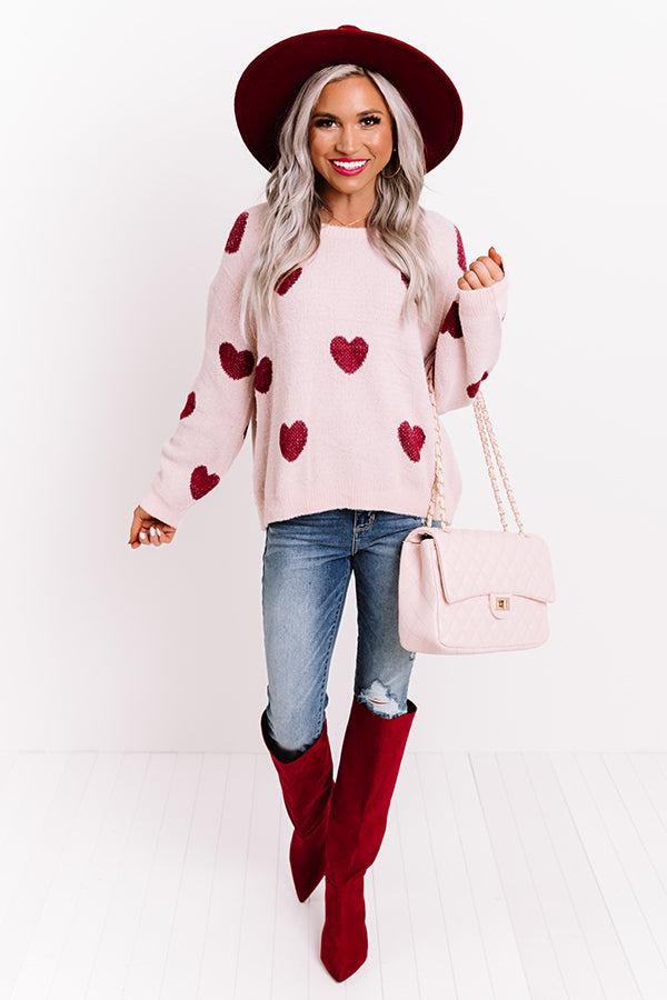 We have no doubt his adorable light pink sweater will have your heart with its soft lightweight tight knit material patterned with dark red hearts, a wide rounded neckline, long loose sleeves, an a relaxed silhouette that ends in a straight hemline! Measurements