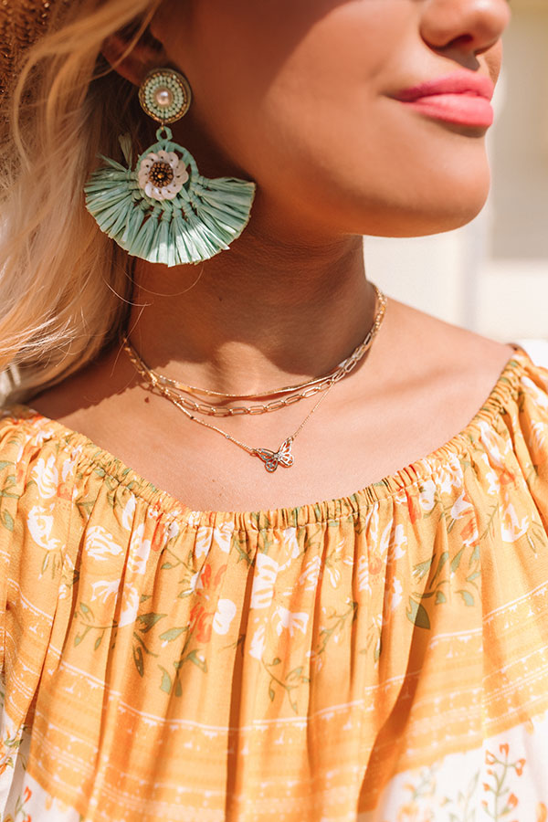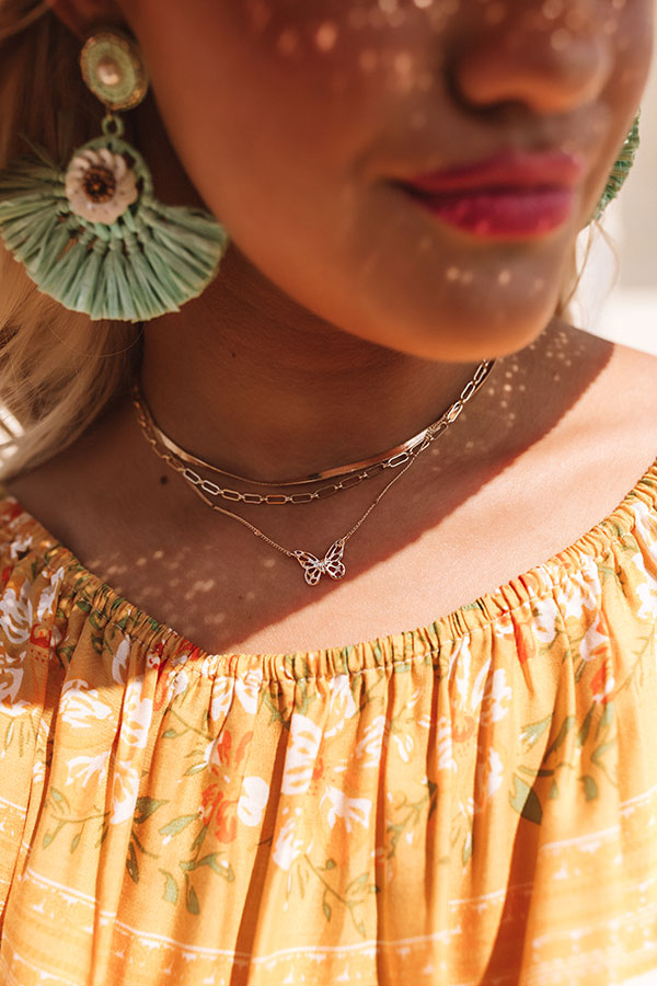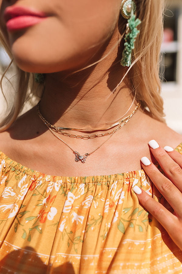 This adorable gold necklace is sure to "make your heart flutter" with its three layered pieces featuring a snake chain, an oversized link chain, and a dainty chain with a butterfly charm!