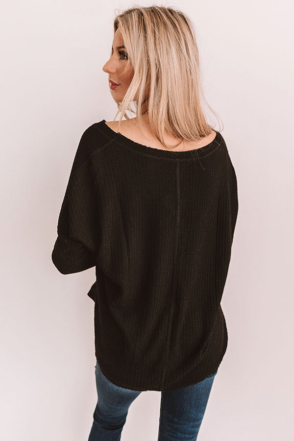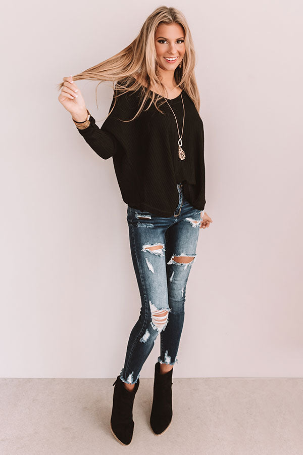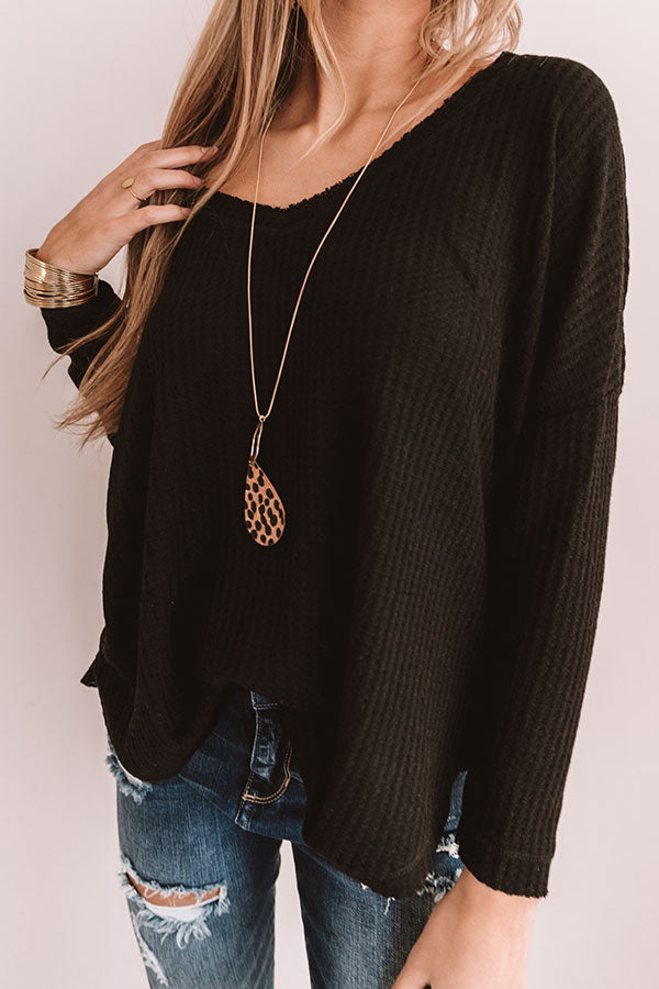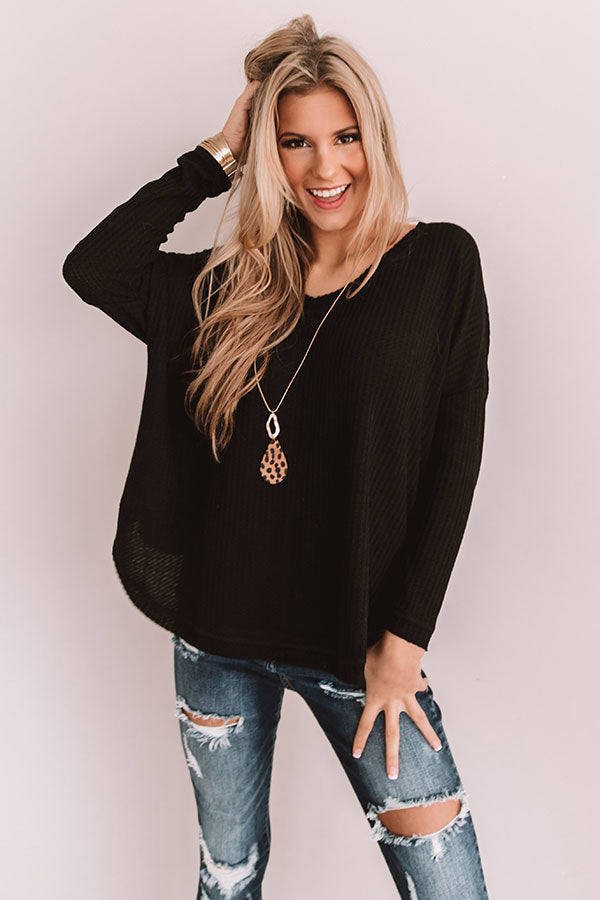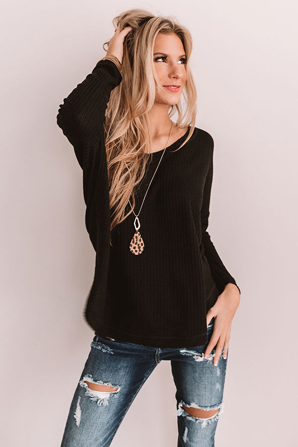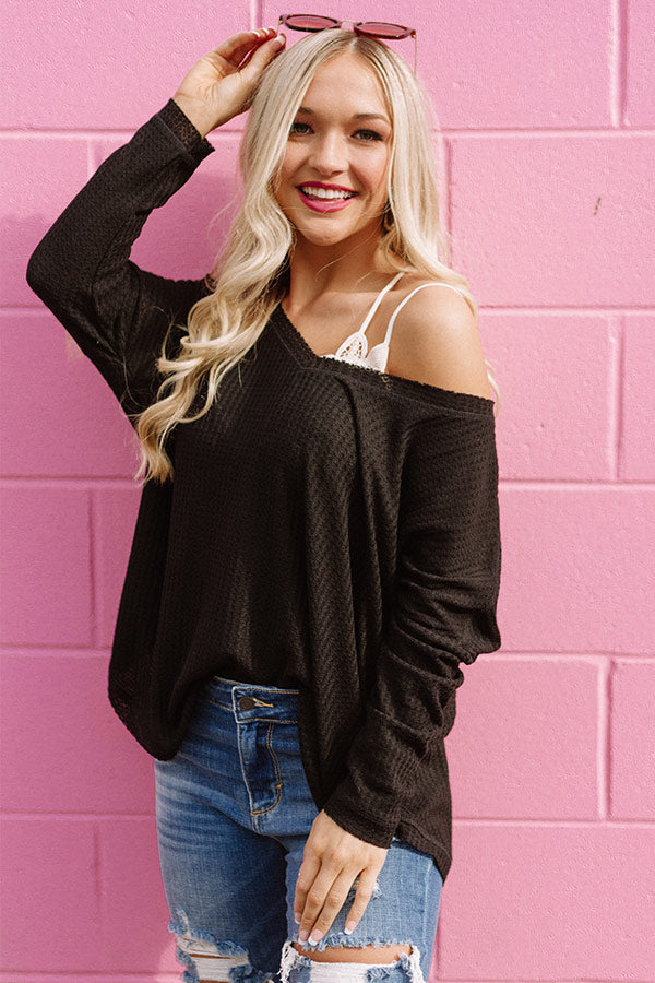 Our black "Your Dream Girl" shift top is a classic piece you'll love with a feminine twist! It features soft lightweight material with waffle knit texturing, long loose sleeves, a wide rounded neckline that can be worn to one side, and a relaxed silhouette that falls into a rounded hemline! We have styled this adorable piece with some distressed dark wash skinnies and cheetah print espadrilles, but you can also wear it with our "Name Dropper Faux Suede Skirt in Mocha" and blush accessories like "The Saylie Peep Toe Heel," our "Pass The Prosecco Wool Hat in Blush," and our "City Sleek Quilted Crossbody!" Measurements