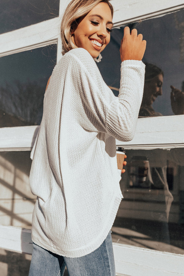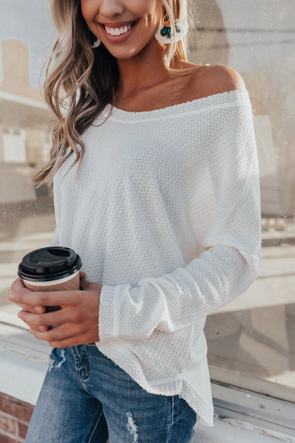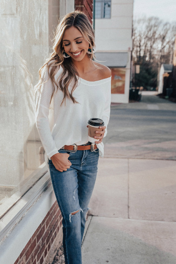 Our white "Your Dream Girl" shift top is a classic piece you'll love with a feminine twist! It features soft lightweight material with waffle knit texturing, long loose sleeves, a wide rounded neckline that can be worn to one side, and a relaxed silhouette that falls into a rounded hemline! We have styled this adorable basic with some relaxed denim and a neutral statement belt and gator bootie, but you can also dress it down be wearing it with our "Under The Stars Camo Joggers," "The Delaney Sneaker in Gold," and an olive colored beanie and backpack! Measurements