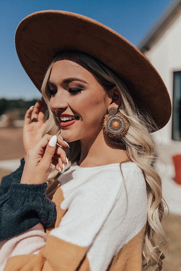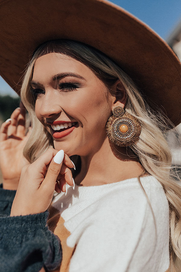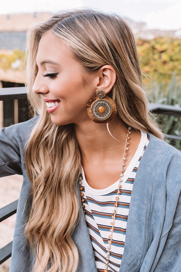 You will be a vision to look at when you accessorize with these stunning statement earrings featuring gold beaded circles, faux diamonds, and bronze tassel fan detailing!