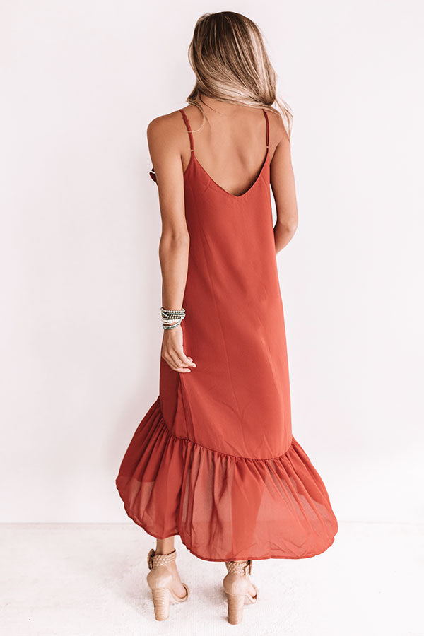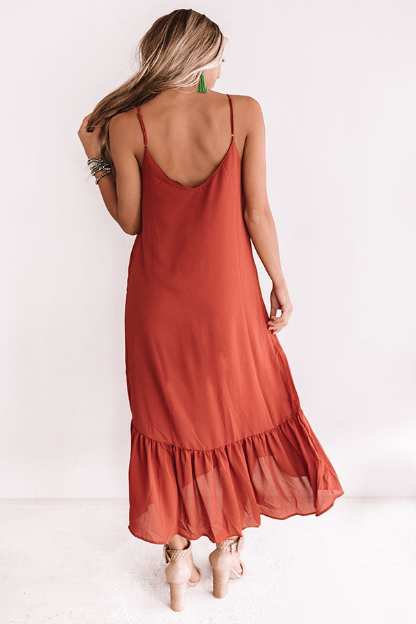 We see martinis and midis in your future and there couldn't be a more perfect summer dress than this flowy scarlet one! With the mid-calf length and ruffle top, you will look elegant while wearing this scarlet, spaghetti strap piece. Style this sweetheart with some nude heels and colored jewelry for an effortless everyday look that will have you rushing out the door to meet your friends! Measurements