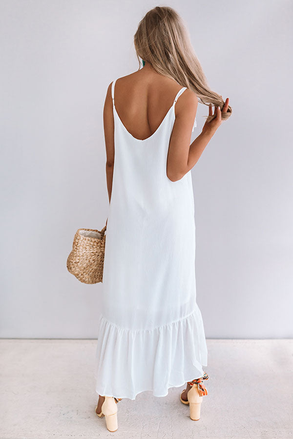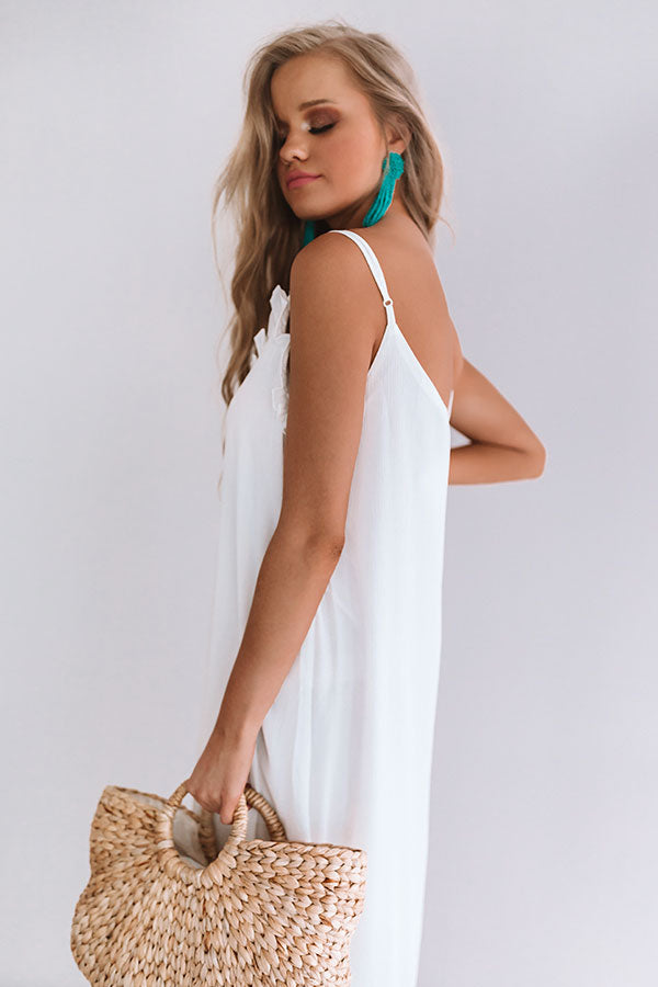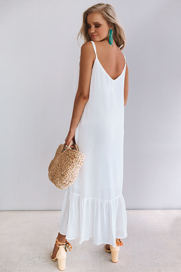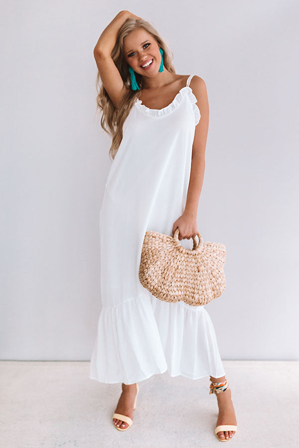 We see martinis and midis in your future and there couldn't be a more perfect summer dress than this flowy white one! With the mid-calf length and ruffle top, you will look elegant while wearing this white, spaghetti strap piece. Style this sweetheart with some sandals and a small bag for an effortless everyday look that will have you rushing out the door to meet your friends! The slip under this dress allows you to rock it by itself while still having full coverage.