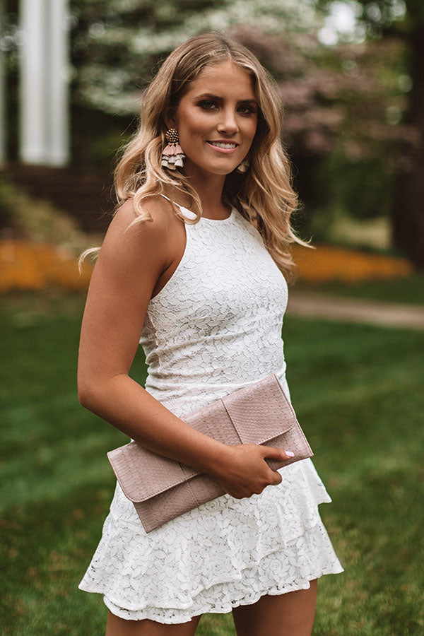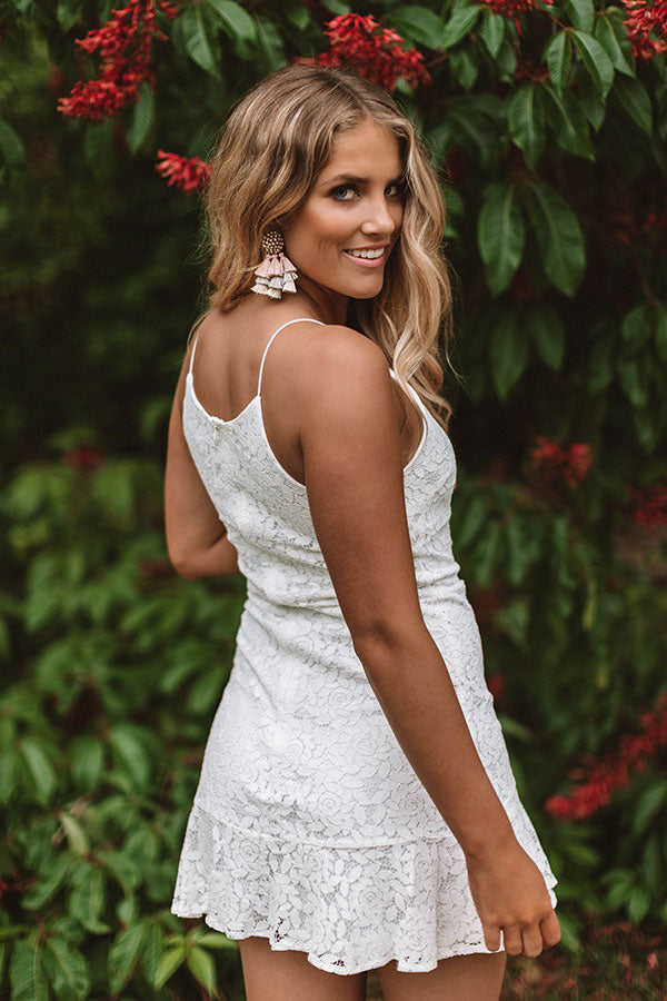 Stay classy and sassy in the "You're Still The One" white dress with its exquisite lace detailing, spaghetti straps, and form fitting bodice with a flared, ruffled skirt! This elegant piece can be styled with a neutral shoe and clutch, but when you pair it with rich wine colored accents like our "Haute For Happy Hour Heel" and "Wine Spritzer Earrings" there is no doubt you people will be doing a double take!