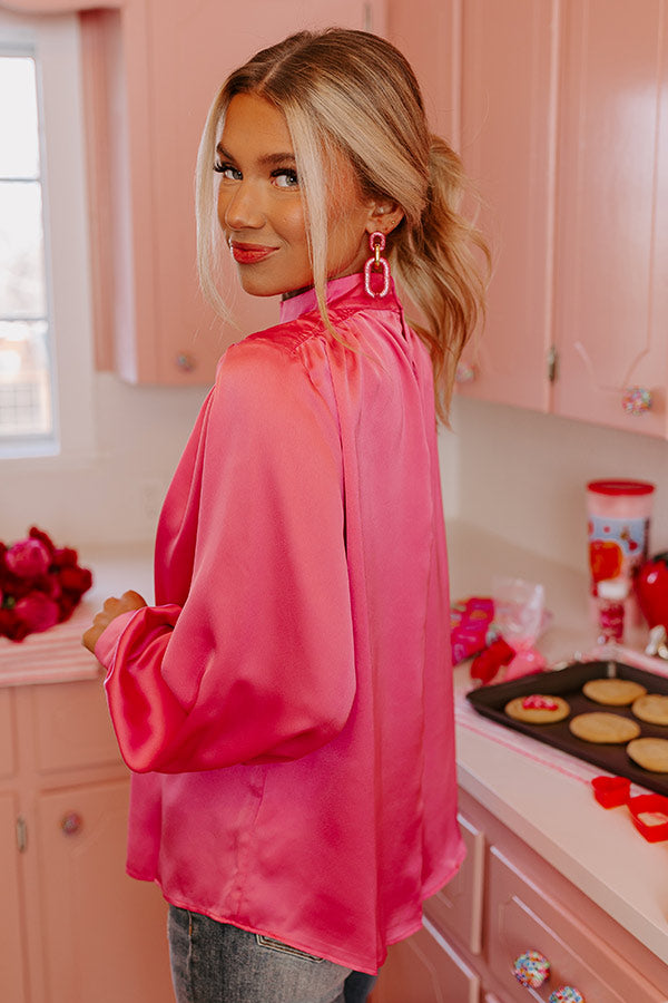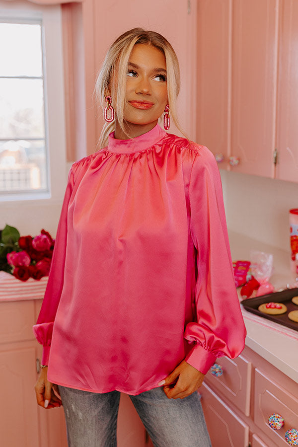 - Trendy faux turtle neckline with back button closure and gathered detail
