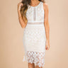 Affordable elegance is possible, ladies! We are OBSESSED with this Little White Dress! Neutral lining to the mid-thigh is interrupted by the prettiest little open 'T' shaped crochet detail, accentuating your waist. This dress has a full zipper in the back, making it make-up smudge proof! This dress is perfect for any one of your upcoming bridal or formal events! Measurements